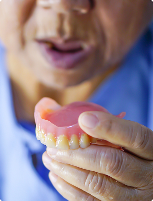 Clean your dentures daily with a soft brush and denture cleaner (not toothpaste, which can be abrasive). Remove and rinse after eating and soak overnight in a denture solution or room temperature water. Handle carefully to avoid dropping and visit us regularly for professional adjustments and checks.